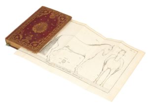 BRUGNONE (Gioanni). La Mascalcia o sia La Medicina veterinaria ridotta ai suoi veri principi. In Torino, Nella Stamperia Reale, 1774. In-8°, maroquin rouge, large encadrement de filets et décor aux petits fers dorés, fleuron aux angles, motif de corbeille à l’oiseau en pied, armoiries au centre, dos lisse orné, tranches dorées (reliure italienne de l’époque). XXVII + [V] + 279 + [I] (« Errori Correzioni ») pp. Trois planches hippiques repliées. Ex-libris manuscrit sur le titre. Dos et mors frotté : accident aux coiffes : rousseurs, mais BEL EXEMPLAIRE DE DÉDICACE en MAROQUIN ROUGE AUX ARMES de VICTOR-AMÉDÉE III (1726-1796), ROI DE SARDAIGNE en 1773.
