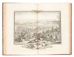 [EUGÈNE de SAVOIE]. «Eugene and Marlbro’ each illustrious name with equal merit claims immortal fame ». S.l. [Londres], Du Bosc, n.d. [circa 1735]. In-folio, veau, dos à nerfs orné d’armoiries répétées (reliure de l’époque). Un titre-frontispice (orné des portraits en médaillon d’Eugène de Savoie et de Marlborough) par G. SCOTIN d’après François BOUCHER et 32 planches dont une sur double-page, gravées par Du BOSC d’après A. BENOIST. Nos planches sont datées 1735. De la bibliothèque de M.r Riston, avec ex-libris. Coiffe de tête et coins accidentés: un mors fendu sur 5 cm. Ces planches sont destinées à illustrer l’ouvrage de John Campbell The military history of the late Prince Eugene of Savoy, and of the late John duke of Marlborough [...]. Londres, 1736-1737 (2 vols.). EXEMPLAIRE portant au dos les ARMES COLBERT.