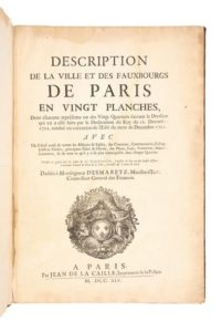 [La CAILLE (Jean de)]. Description de la ville et des fauxbourgs de Paris en vingt planches […]. A Paris, Jean de La Caille, Imprimeur de la Police, 1714. In-plano, veau, dos à nerfs orné (reliure de l’époque). Armoiries royales sur le titre, trois bandeaux, un plan général de Paris sur double page par Van LOON et 22 plans de quartier dont cinq sur double page, par SCOTIN le JEUNE, L. BOUDAN, LUCAS & C. INSELIN. « Dressée & gravée sous les ordres de M. d’ARGENSON […] Dediée à Monseigneur DESMARETZ, Ministre d’Etat, Controlleur General des Finances. » Coiffe de tête manquante : mors fendillé : épidermures : mouillures en tête de volume. Brunet, II, 615.