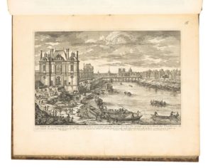 [PÉRELLE & SILVESTRE]. «Veues Les Maisons de France ». S.l.n.d. [A Paris, Chez N. Langlois, circa 1680]. Recueil de 129 gravures en un volume petit in-folio, demi- veau brun, dos lisse orné (reliure début XXe s.). Album réunissant 129 gravures dont trois contrecollées in fine, par Gabriel, Nicolas et Adam PÉRELLE & Israël SILVESTRE: table manuscrite des planches, montée sur onglet in fine. Œuvre gravée de la famille PÉRELLE constituée de vues, monuments et perspectives de Paris et Versailles mais aussi de Rome. Dos passé : quelques rousseurs marginales: déchirure sans manque et sans atteinte à la gravure planche 45. Brunet, IV, 494.