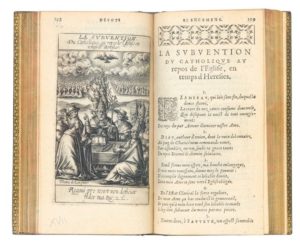 RAMBERVILLER (Alphonse de). Les Devots elancemens du poete chrestien […]. A Toul, Par François du Boys, Imprimeur du Roy, 1610. 4 parties en un volume in-12, maroquin vert, double filet estampé à froid encadrant les plats, dos à nerfs orné du même décor, tranches dorées (Duru 1850). Onze cahiers chiffrés : à12, A-H12, I6 & K4 (le dernier blanc et quelques erreurs dans le cahier G) : paginés :[II] +22 (avec erreurs de pagination) + 210 + [II blanches] pp. Vingt figures gravées dont un titre orné par Thomas de LEU et dix-neuf par Jacob de WEERT. TRÈS RARE ÉDITION TOULOISE. Cette édition reprend le titre (dont le nom et l’adresse ont été changés) et dix-neuf des 21 figures de l’édition de Pont-à-Mousson de 1602/1603. Les IXe et XXIe figures, introduisant les IIe et IVe parties (pp. 48 & 160) n’ont pas été reprises. Quelques pièces ont été suprimées dont « Les larmes publiques sur le trépas de […] Philippe Emmanuel de Lorraine, duc de Mercoeur ». L’exemplaire de la Bibliothèque Nationale de France est incomplet de quatre figures : • la VIIIe: « La resolution du Penitent a la Satisfaction. » (1602/1603 f. 65/66 - 1610, p. 38) : • la XVIIe : « La subvention du Catholique au repos de l’Eglise en temps d’Heresies. » (1602/1603, f. 145/146 - 1610, p. 108), • la XIXe : « L’intercession pour le soulagement des Catholiques Deffunts. » (1602/1603, f. 173/174 - 1610, p. 132), et • la XXe : « La consideration de la Mort. » (1602/1603, f. 187/188 - 1610, p. 144). Des bibliothèques de Saint-Georges d’Aunay et Léon Rattier, avec ex-libris. Brunet, IV, 1093-1094 (qui cite la correction fautive de la date) : Schumann, 327 « Ce volume de poe?sies asce?tiques est tre?s recherche? pour les planches grave?es qu’il renferme » : Langlard, 268 : Bulletin du Bibliophile 1896, pp. 232 à 243.