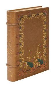 FRANCE (Anatole). Pierre Nozière. Paris, Alphonse Lemerre, Éditeur, 1899. In-8°, maroquin brun, large dentelle florale mosaïquée encadrant les plats, dentelle mosaïquée intérieure, dos à nerfs mosaïqué, tranches dorées sur témoin, couverture conservée, étui (Ch. Meunier. 1900). ÉDITION ORIGINALE. Portrait de l’auteur en frontispice. Un des 140 exemplaires du tirage de tête, celui-ci (n°51), un des 100 sur hollande, paraphé par l’éditeur. Dos légèrement passé. De la bibliothèque Dr. H. Stilling, avec ex-libris relié.