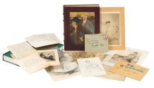 CARCO (Francis). Quelques-unes. S.l., Pro Amicis, 1931. 2 volumes in-4° (dont un pour les suites dans une chemise à rabats et étui vert), maroquin brun, large décor personnalisé mosaïqué ornant le premier plat, dos à nerfs, tranches dorées, doublure mosaïquée et garde de moire prune, couverture illustrée conservée, chemise en demi-maroquin, dos mosaïqué, étui (Déc. Lehaye • Lagadec Rel.). 46 eaux-fortes dont treize hors texte par Louis LEGRAND. Tiré à 142 exemplaires, celui-ci (n°12), un des 126 sur arches comprenant l’une des 26 suites supplémentaires. EXEMPLAIRE UNIQUE enrichi de TROIS DESSINS ORIGINAUX SIGNÉS dont deux en couleurs, D’UN PETIT CROQUIS ORIGINAL, et D’UNE EAU-FORTE NUMÉROTÉE (6/50) ET SIGNÉE PAR L’ARTISTE (anciennement encadrée avec marge assombrie). Le décor ornant le premier plat de la reliure correspond à la planche située entre les pages 34/35. De la bibliothèque Fernand J. Nyssen et Laurent Meeûs, avec ex-libris. Le deuxième volume comporte : •UNE SUITE SUPPLÉMENTAIRE des illustrations sur papier calque, •UN CUIVRE (celui de la planche située entre les pages 54/55), •un ensemble de TROIS L.A.S. de Louis LEGRAND (datées de 1945 & 1947) envoyées à Fernand Nyssen, et UN PORTRAIT d’Eugène RODRIGUES (alias Erastène Ramiro) gravé à l’eau-forte par Armand RASSENFOSSE. ENSEMBLE DEUX VOLUMES.