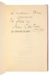 COCTEAU (Jean) Le Grand écart. Roman. Paris, Librairie Stock, 1923. In-12, maroquin bordeaux, jeu de filets dorés encadrant les plats, dos à nerfs orné du même, tranches dorées sur témoin, non rogné, doublure et garde de maroquin bordeaux, couverture rose conservée (reliure de 1928). ÉDITION ORIGINALE du premier roman de Cocteau. Tiré à 625 exemplaires, celui-ci (n° 17), UN DES 25 DE TÊTE SUR JAPON IMPÉRIAL. De la bibliothèque Charles Hayoit, avec ex-libris. ENVOI DE L'AUTEUR sur le faux-titre, à Louis Brun, bibliophile et directeur des éditions Grasset entre 1909 et 1939. Talvart, III, 181. Provenance : Vente Charles Hayoit, Sotheby's Poulain-Le Fur, Paris 30 novembre et 1er décembre 2001, lot 962.
