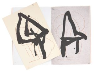 MOTHERWELL (Robert) & PLEYNET (Marcelin). Beau geste pour Lucrece. S. l. [Paris], Editions Daniel Papierski, n. d. [1989]. Petit in-8° en feuilles, sous couverture orange illustrée du monogramme de l’artiste. ÉDITION ORIGINALE. Poèmes de Marcelin PLEYNET illustrés de six lithographies en deux tons, numérotées et signées, par Robert MOTHERWELL. Petites salissures au dos de la couverture.