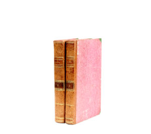ou de la confédération Creek, et le pays de Chactaws. À Paris, chez Maradan, an IX [1800-1801]. — 2 volumes in-8, (4 dont celles aux versos blanches)-457-(3 dont les première et dernière blanches) + (4 dont celles aux versos blanches)-436-(2 dont la dernière blanche) pp., demi-basane blonde, dos mouchetés ornés de filets pleins et pointillés dorés avec pièces de titre et de tomaison brunes et marrons, plats cartonnés de papier rose à coins de parchemin vert, tranches jaunes (reliure de l'époque).