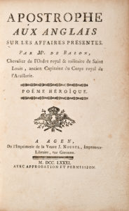 BAZON DE BAULENS (Jean de). — Apostrophe aux Anglais sur les affaires présentes [...]. — Poème héroïque. — À Agen, de l'imprimerie de la veuve J. Noubel, 1781. In-8, 63-(une blanche) pp., basane brune, dos lisses, cloisonné et orné de...