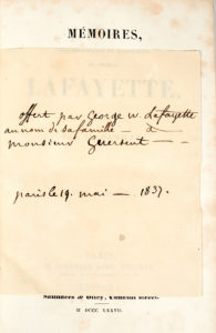 EX-DONO AUTOGRAPHE SIGNE DE GEORGES WASHINGTON DE LA FAYETTE, FILS DU MARQUIS, adressé au docteur Guersant, daté de Paris le 19 mai 1837 (sur un papillon relié face au titre du premier volume).