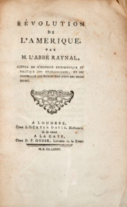 ÉDITION SEPAREE, parmi plusieurs parues en cette année 1781, des passages consacrés à la naissance des États-Unis dans son ouvrage Histoire philosophique et politique des établissemens et du commerce des Européens dans les deux Indes, soit les 15 derniers chapitres (XXXVIII à LII) du livre XVIII du tome IX de la 3e édition augmentée parue en 1780.