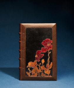 queue, plats ornés de deux grandes compositions mosaïquées de cuir ciselé polychrome sur fond noir dont une signée « Ch. Meunier 96 », doublures de maroquin rouge avec encadrement de filets dorés et d'une dentelle florale dorée à incrustations de cuir bleu, gardes de soie olive, tranches dorées sur témoins, couvertures et dos, chemise doublée à dos et bandes de maroquin brun, étui bordé, rares rousseurs (Ch. Meunier. 95).