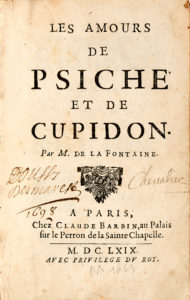 — LA FONTAINE (Jean de). Les Amours de Psiché et de Cupidon. A Paris, chez Claude Barbin, 1669. Petit in-8, veau brun granité ; reliure un peu frottée avec accroc à la coiffe supérieure, inscriptions anciennes disgracieuses sur le premier contreplat et en marge d'un feuillet (reliure de l'époque). Édition originale. Provenance : famille de Coussy à Bisseuil, dans l'actuel département de la Marne (ex-libris manuscrits sur le titre et sur une des dernières gardes).
