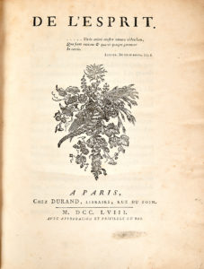 — [HELVETIUS (Claude-Adrien)]. De l'Esprit. À Paris, chez Durand, 1757. Grand in-4, veau fauve marbré ; quelques annotations marginales de l'époque à l'encre ; reliure frottée, mors restaurés et fendus (reliure de l'époque). Édition originale, en premier tirage, avec les caractéristiques précisées par David Smith. Provenance : le diplomate et bibliographe spécialiste de Voltaire Georges Bengesco (vignette ex-libris), et le prince Roland Bonaparte, petit-fils de Lucien Bonaparte, géographe, ethnographe, botaniste et photographe (vignette ex-libris).