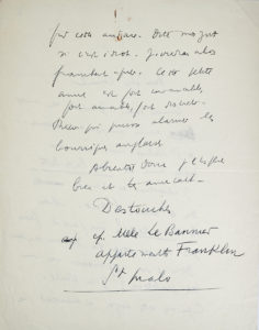« Mon cher consul, encore moi ! JE MEDITE DE MONTER ENCORE UNE FOIS A L'ASSAUT DE S[AIN]T-HELIER [principal bourg de Jersey] mais avec une petite amie [sa future épouse Lucette Almanzor] et deux bicyclettes. J'aborderai de S[ain]t-Malo dans le début d'août. Mais les bicyclettes ? Que faut-il faire pour ne pas payer la douane anglaise ? Dois-je vous assommer avec un tel problème ? J'ai honte. Enfin vous êtes toujours si amical que [je] prends cette audace. Dites-moi juste si c'est idiot. Je viendrai alors franchement expier. Cette petite amie est fort convenable, fort aimable, fort discrète. RIEN QUI PUISSE ALARMER LES BOURRIQUES ANGLAISES... »