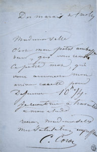 COROT (Camille). — Lettre autographe signée à une jeune femme. « Des marais de Presles », [probablement juin 1854]. — Une p. in-8, en-tête gaufré aux initiales « C. G. ».