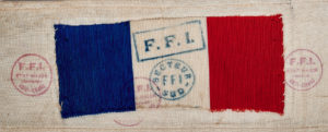 DEUXIÈME GUERRE MONDIALE. - Rare brassard des Forces Françaises de l'Intérieur. — Rectangle de tissu tricolore cousu sur une bande de tissu blanc (8 x 25,5 cm), avec estampilles « F.F.I. » et « F.F.I. Secteur Sud », à l'encre bleue, et «...