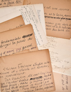 — • Notes autographes. 17 ff. de formats divers. Notamment sur la part vécue et fictive dans les travaux littéraires, sur « l'idée de Dieu » (avec dessins), sur des objets archéologiques grecs et égyptiens qui ont suscité son intérêt, sur la maternité d'Anne d'Autriche, sur sa propre histoire familiale croisée avec celle de Victor Hugo, copie d'une lettre qu'il a adressée au préfet de police pour dénoncer une escroquerie portant sur de faux manuscrits proposés en son nom à Charavay et à Maggs.