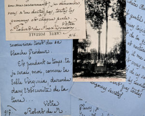 — • Billet autographe signé à un critique. 1916. Sur 2 cartes postales avec, aux versos, des vues photographiques du parc de SON « CASTEL D'ARTAGNAN ». « J'achève de lire votre bel article, avec toute l'émotion que vous pouvez souhaiter. L'expression "homme de ralliement" est une trouvaille. Et, du fleuron, qui termine la page, en me couronnant, je dénombre, vous n'en doutez pas, toutes les gemmes et chaque perle... »