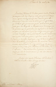 NECKER (Jacques). — Lettre signée en qualité de directeur général des Finances, adressée à la Duchesse de Villeroy, Jeanne-Louise Constance d'Aumont. — Paris, 29 avril 1780. Une p. in-folio.