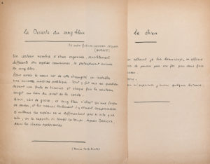 — « LE CHIEN ». « Libre en allant je lis beaucoup, m'efforce par devoir de penser par ma foi par deux fois sur ces traces. Amis, voici. Si j'ai pu m'exprimer j'aurai quelques lecteurs. » (1/2 p. in-4). Texte composé en mai 1924, et intégré en 1961 dans la partie « Pièces » du volume Le Grand recueil chez Gallimard.