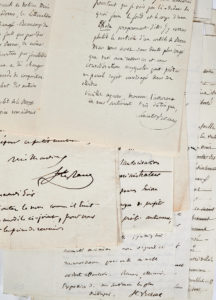 — • Correspondance de 15 lettres (14 autographes signées et une autographe), adressées au bibliographe Antoine Rochebilière. 1850-1869 et s.d. Concernant François-René de CHATEAUBRIAND, le polygraphe et homme politique Charles-Athanase Walckenaer, secrétaire perpétuel de l'Académie des inscriptions et belles lettres, ALFRED DE VIGNY, le sénateur Narcisse Vieillard (ancien précepteur de Napoléon III), le général Alexandre d'Alton, des livres prêtés qu'il souhaite rendre (dont un numéro du Bulletin du bibliophile), une statuette que son correspondant lui offre, etc.
