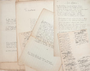 — • Poème autographe : « Enfant douce, oh si douce, enfant cruelle aussi... », en deux versions avec variantes, chacune environ 18 vers sur 1 p. in-8, avec nombreux ajouts et corrections, dont quelques vers incomplets, sur un bifeuillet de papier fragile avec fentes.