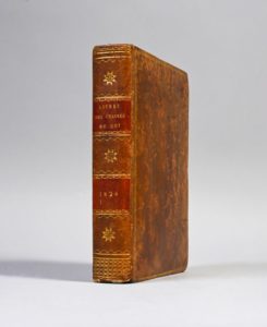 Livret des Chasses du Roi, pour 1824 [Paris], [1824] AUTRE EXEMPLAIRE, RELIÉ EN VEAU À L’ÉPOQUE ÉDITION ORIGINALE. In-8 (201 x 152 mm). 476 pp. RELIURE DE L’ÉPOQUE. Veau raciné, roulette dorée en encadrement, dos long orné, tranches jaunes. PROVENANCE : comte Aimé Louis Mottin de La Balme (1865-1935 ; ex-libris) -- comte Georges Thibault de La Carte de La Ferté-Sénectère (1913-1992 ; ex-libris ; sa vente, Blois, 2021, n° 612). Thiébaud, 609-610 -- Souhart, 640-641