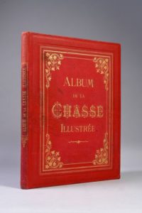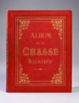Album de la chasse illustrée Paris, Librairie Firmin Didot frères, [vers 1885] BELLES GRAVURES ÉDITION ORIGINALE. In-folio (440 x 340mm). Frontispice d’après J. Gélibert, vignette sur la page de titre et 40 planches d’après Gélibert, Riou, Huyot, Bellecroix, Yan’Dargent, Lançon, Neuville, etc., chaque planche précédée d’un feuillet de titre. RELIURE DE L’ÉPOQUE. Cartonnage de l’éditeur percaline rouge, grand décor doré avec titre au centre, tranches dorées. Thiébaud, 11-12. Mouillure dans l’un des angles intérieurs allant en s’atténuant