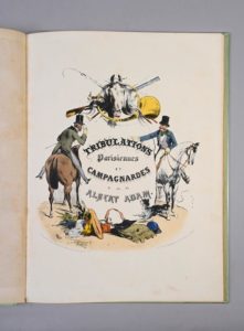 ADAM, Albert Tribulations parisiennes et campagnardes Paris, Hautecœur frères, [vers 1840] BON EXEMPLAIRE DE CET ALBUM HUMORISTIQUE, EN CARTONNAGE DE L’ÉDITEUR ÉDITION ORIGINALE. In-4 (336 x 258 mm). COLLATION : (17) ff. ILLUSTRATION : 33 lithographies originales par Godard d’après Adam, dont 1 titre, mises en couleurs à l’époque et gommées. RELIURE DE L’ÉDITEUR. Cartonnage vert d’eau, titre illustré sur le plat supérieur, dos à la bradel, non rogné. PROVENANCE : Andrée Mégard (1869-1952 ; ex-libris) Décharge sur les feuillets de garde. Légères usures à la reliure, quelques anciennes réfections de papier sur les plats