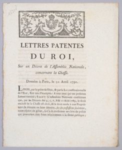 [ARRÊT]. Lettres patentes du roi sur un Décret de l’Assemblée nationale concernant la chasse Paris, 30 avril 1790 RESTRICTION DU DROIT DE CHASSE DONNÉ AU PEUPLE EN AOÛT 1789, SUR UNE IDÉE DE L’ÉVÊQUE DE CHARTRES, JEAN-BAPTISTE DE LUBERSAC. UN PAS EN AVANT, DEUX PAS EN ARRIÈRE 7 pp. in-4. Vignette gravée aux armes royales. “Il est défendu à toutes personnes de chasser, en quelque temps & de quelque manière que ce soit, sur le terrain d’autrui, sans son consentement”