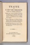 BOISROT DE LACOUR, comte Jacques Traité sur l’art de chasser avec le chien courant Clermont, Landriot, 1808 L’UN DES PLUS RARES TRAITÉS DE CHASSE DE LA PÉRIODE NAPOLÉONIENNE ÉDITION ORIGINALE In-8 (184 x 114 mm). Introduction dédiée au Maréchal Berthier, Grand Veneur de la Couronne COLLATION ET ILLUSTRATION : VIII, 200 pp., 2 plans gravés sur bois, repliés et contrecollés sur toile RELIURE SIGNÉE DE PETIT. Maroquin vert, décor doré en encadrement, dos à nerfs orné et doré, tranches dorées BIBLIOGRAPHIE : Thiébaud, 107-108 -- Schwerdt, I, 74 “very rare” -- Souhart, 63