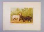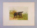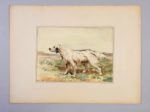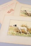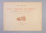 CAILLARD, Paul Les Chiens d’arrêt Paris, J. Rothschild, 1890 SUPERBE ET SAVANT OUVRAGE SUR LES CHIENS D’ARRÊT REPRÉSENTÉS EN 12 CHROMOLITHOGRAHIES D’OLIVIER DE PENNE. AVEC DEUX GRANDES AQUARELLES ORIGINALES SUPPLÉMENTAIRES ÉDITION ORIGINALE et ILLUSTRÉE In-folio (480 x 365mm). Titre en rouge et noir avec la justification au verso, faux-titre, 50 vignettes COLLATION : 3 ff. n. ch, viii pp. (table des ch. et table des illustrations), 146 pp., 1 f. n. ch. de table des matières TIRAGE : un des 1650 exemplaires numérotés sur papier blanc, celui-ci le n° 1565 ILLUSTRATION : 12 chromolithographies imprimées à pleine page représentant des chiens d’après des aquarelles d’Olivier de Penne, chacune des planches est montée sur bristol et précédée d’une serpente sur papier rose portant le titre de la planche et quelques brèves indications. Les races de chien sont les suivantes : Setter Gordon, Setter blue Belton, Setter blanc et orange, Pointer, Pointer mâle, Pointer blanc et citron, Curly-retriever, Susses spaniel et Clumber spaniel, Spaniel cocker et Water spaniel, Beagles, Chien de nuit ILLUSTRATION ORIGINALE AJOUTÉE : 2 grandes aquarelles originales (275 x 205mm) non signées mais attribuables à Olivier de Penne représentant : Snowdrift, le Setter blue Belton de la pl. 2 et Paris, le Pointer de la pl. 5 EN FEUILLES, SOUS CHEMISE EMBOÎTAGE DE L’ÉDITEUR. Toile verte, plat supérieur avec le titre illustré, rabats Emboîtage légèrement écorné, exemplaire en bon état mais de manipulation fragile BIBLIOGRAPHIE : Thiébaud, 147