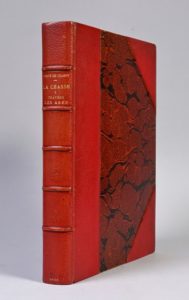 CHABOT, Auguste, comte de La Chasse à travers les âges. Histoire anecdotique de la chasse chez les peuples anciens et en France depuis la conquête des Gaules jusqu’à nos jours Paris, Arthur Savaète, 1898 BEL EXEMPLAIRE D’UN IMPORTANT OUVRAGE SUR L’HISTOIRE DE LA CHASSE ÉDITION ORIGINALE. Lettre de dédicace écrite du Parc-Soubise en juin 1908, lettre du marquis Costa de Beauregard au comte de Chabot. In-folio (322 x 245mm). Titre imprimé en rouge et noir. 4 ff. n. ch., 408 pp. 4 planches en couleurs hors texte, 250 gravures imprimées dans le texte dont un grand nombre à pleine page. RELIURE DE L’ÉPOQUE SIGNÉE DE RICHARDOT. Dos de maroquin rouge à coins, couverture verte conservée illustrée d’une amazone dorée. Thiébaud, 161 -- Schwerdt, I, p. 101