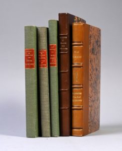 CHABOT, comte Auguste de Chasses à tir et à courre. (Récits et souvenirs) Angers, Siraudeau, [1906] QUELQUES LIVRES ILLUSTRÉS DU XXe SIÈCLE, TOUS RELIÉS 5 volumes reliés : 1. ÉDITION ORIGINALE. In-8 (215 x 124 mm). Toile verte, dos à la bradel, plats de couverture conservés. PROVENANCE : Jean-Jacques Journet (ex-libris manuscrit daté de 1930). Thiébaud, 161. 2. FUYE, Maurice de La. La Chasse des bécassines. Blois, Duguet, 1922. Édition originale. Croquis de Louis de Lajarrige. Reliure signée de Lobstein. Dos à nerfs de maroquin brun (relié sans la couverture). Thiébaud, 547. 3. CHAUDENAY, Jean de. Saint Hubert et les dames. Paris, L’Éleveur, 1925. ÉDITION ORIGINALE. In-8. Exemplaire numéroté 206. Illustrations du baron Karl Reille. Envoi autographe signé de l’illustrateur à Jean-Jacques Journet surmonté d’un petit dessin original à l’encre noire et au crayon (70 x 80 mm) représentant une chasse au cerf. Toile verte, dos à la bradel, plats de couverture conservés. Ex-libris manuscrit de Jean-Jacques Journet, daté de 1930. Thiébaud, 188. 4. MARTIMPREY, comte René de. Contes de vénerie. Paris, Le Goupy, 1926. ÉDITION ORIGINALE. In-8. Un des 500 exemplaires sur vélin (n° 268). Illustrations du baron Karl Reille. Envoi autographe signé de l’illustrateur à Jean-Jacques Journet surmonté d’un dessin original aux encres bleue et noire (70 x 140 mm) représentant une chasse au cerf. Toile verte, dos à la bradel, plats de couverture conservés. Thiébaud, 638. 5. PRÉJELAN, René. Souvenirs d’un fusil de chasse. Paris, Revue Adam, 1949. Édition originale. In-8. Dessins de l’auteur. Reliure : dos à nerfs de chagrin fauve, tête jaspée, couverture conservée