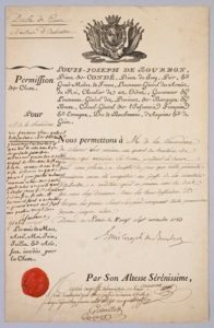 CONDÉ, Louis-Joseph de Bourbon, Prince [P. S.]. Permis de chasser pour M. de La Chevardière Paris, 1785, 27 novembre BEAU DOCUMENT : UN PERMIS DE CHASSER SIGNÉ PAR LE PRINCE DE CONDÉ 1 p. in-folio, imprimée, signée par Louis-Joseph, Prince de Condé (1736-1828) et contresignée par Jean-Gabriel de La Fontaine (né en 1728), Maître particulier des Eaux-et-forêts de la maîtrise d’Aubenton (Aisne). En-tête aux armes Condé gravées sur bois. Mention manuscrite “Duché de Guise. Maîtrise d’Aubenton”. Cachet de cire rouge aux armes Condé. Permis de chasser à “M. de La Chevardière de chasser sur environ un quart du territoire de Luzoir[e] qui avoisine ses terres”...