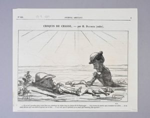 DAUMIER, Honoré [Suites libres de 52 planches]. [Paris], 1844-1854-1864 DAUMIER ILLUSTRANT LA CHASSE. DROIT, PEUPLE, ARISTOCRATIE : LA LUTTE SOCIALE AUTOUR DE LA CHASSE RACONTÉE PAR L’IMAGE ILLUSTRATION : suites libres de 52 lithographies originales imprimées en noir : 1. Croquis de chasse : “Décidément, ce qu’il y a de plus amusant dans la chasse, c’est le dîner”, 1864, Delteil 3343 ; 2. Croquis de chasse : “On ne m’y prendra plus...”, 1864, Delteil 3339 ; 3. Croquis de chasse : “Voyons... Il est déjà trois heures et demie”, 1864, Delteil 3338 ; 4. Croquis de chasse : “Trop de politesse”, Delteil 2992 ; 5. Croquis de chasse : “Ouverture de la chasse”, Delteil 2720 ; 6. Croquis de chasse : “Un lièvricide”, Delteil 2471 ; 7. Croquis de chasse : “Deux chasseurs vivaient en paix”, Delteil 2470 ; 8. Croquis de chasse : “Les plaisirs de la chasse en temps de neige”, Delteil 2466 ; 9. Croquis de chasse : “Un chasseur qui a de l’amour-propre”, Delteil 2465 ; 10. Croquis de chasse : “Saprelotte, quelle chance”, Delteil 2462 ; 11. Croquis de chasse : “En v’la une bonne chasse”, Delteil 2461 ; 12. Croquis de chasse : “Une charge déplacée”, Delteil 2462 ; 13. Croquis de chasse : “T’nez not Maitr’”, Delteil 2459 ; 14. Croquis de chasse : “Que j’vous rendons c’lièvre”, Delteil 2458 ; 15. Croquis de chasse : “Un chasseur novice”, Delteil 2455 ; 16. Croquis de chasse : “Une fâcheuse rencontre”, Delteil 2454 ; 17. Croquis de chasse : “Dépisté”, Delteil 2453 ; 18. Croquis de chasse : : “Inconvénient de chasser”, Delteil 2452 ; 19. Croquis de chasse : : “Retour”, Delteil 2436 ; 20. Croquis d’hiver : “Allant goûter”, Delteil 2728 ; 21. Croquis d’été : “Ouverture de la chasse”, Delteil 2846 ; 22. La chasse, n° 8 : “Je l’ai pris pour un lièvre”, Delteil 309 ; 23. La chasse n° 12, “Prenez donc garde”, Delteil 3023 ; 24. Les beaux jours de la vie : “L’ouverture de la chasse”, Delteil 1116 ; 25. Pastorales : “J’ai vu un lièvre”, Delteil 1437 ; 26. “Mauvaise charge”, Delteil 313 ; 27. La chasse n° 9 : “Vous êtes sûr que le fusil”, Delteil 310 ; 28. La chasse n° 6 : “C’est drôle”, Delteil 307 ; 29. “Qu’est-ce que vous faites-là ?”, Delteil 304 (quelques manques) ; 30. La chasse n° 2 : “Oh ! Un faisan”, Delteil 1073 ; 31. Actualités : “Projet d’une statue”, Delteil 2132 ; 32. Émotions de chasse 3 : “Bertrand et Raton”, 1854, Delteil 2603 ; 33. Émotions de chasse : “Ayant pris le parti”, Delteil 2604 ; 34. Émotions de chasse 14 : “Comme quoi”, Delteil 2614 ; 35. Émotions de chasse 15, “On dit que le chien”, Delteil 2615 ; 36. Les plaisirs de la chasse ! “Voilà pourtant”, Delteil 2723 ; 37. Émotions de chasse : “Allons bon !”, Delteil 2888 ; 38. Émotions de chasse : : “Mr Prudhomme”, Delteil 2887 ; 39. Émotions de chasse 12 : “Tiens”, Delteil 2886 ; 40. Émotions de chasse 11 : “Ce perdreau est mort”, Delteil 2885 ; 41. Émotions de chasse 9 : “Eh bien”, Delteil 2884 ; 42. Émotions de chasse 7 : “Chasseur parisien”, Delteil 2882 ; 43. Émotions de chasse 6 : “Pour s’habituer”, Delteil 2881 ; 44. Émotions de chasse 1 : “Je crois”, Delteil 2878 ; 45. Actualités : “Nouveaux équipements pour la chasse au lion”, Delteil 2951 ; 46. Émotions de chasse 21 : “Allons, m’sieu Pomard”, Delteil 2895 ; 47. Actualités : “Aspects de la rue Lacépède”, Delteil 3028 ; 48. Les jolis chasseurs : “Qu’on dise encore”, Delteil 3335 ; 49. Croquis charivariques : “Dites donc, président”, Delteil 1946 ; 50. Les bons bourgeois n° 39, “Trois heures du matin”, Delteil 1847. 52. Actualités 184 : “Vous êtes garde-champêtre”, Delteil 3531 PIÈCES JOINTES : une cinquantaine de reproductions modernes de Daumier en coloris moderne Dans une chemise-étui de carton