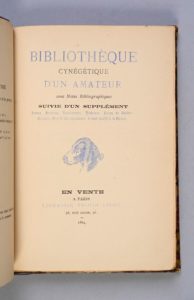 [DEFRÉNOIS, J.] Bibliothèque cynégétique d’un amateur Paris, Didot, 1884 CATALOGUE D’UN AMATEUR DE LIVRES DE CHASSE ÉDITION ORIGINALE. In-8 (190 x 150 mm). Titre imprimé en bleu et noir, nombreuses vignettes imprimées en bleu. [1], 2 ff. n. ch., 228 pp., 1 f. bl. Un des 278 sur papier vergé teinté, troisième papier, celui-ci numéroté 253. RELIURE DE L’ÉPOQUE. Demi basane bleue, dos à nerfs orné, couverture conservée. Thiébaud, 88-89 -- Souhart, 531