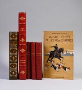FOUDRAS, Louis Auguste Théodore, marquis de [Ensemble de quatre ouvrages du marquis de Foudras] 1861-1946 DE GRANDS CLASSIQUES 6 volumes en tout, tous en éditions originales : 1. La Vénerie contemporaine. Paris, Dentu, Cadot, 1861-[1866]. 3 volumes in-12. Reliures uniformes de l’époque. Dos de percaline rouge. Thiébaud, 419, 423-424. Quelques rousseurs et mouillures, page de titre du vol. 3 restaurée. 2. Les Gentilshommes chasseurs. Paris, Émile Noury, 1932. In-8. Un des 450 exemplaires sur vélin d’Arches (n° 346). Lithographies originales de Reboussin. Reliure de l’époque. Dos à nerfs de chagrin vert orné et doré, tête dorée, couverture et dos conservés. 3. Les Gentilshommes chasseurs. Paris, Éditions littéraires et artistiques, 1943. In-4. Un des 565 exemplaires sur vélin pur chiffon (n° 137). Reliure : dos à nerfs orné et doré et coins de maroquin rouge, couverture et dos conservés. 4. Pauvre défunt M. le curé de Chapaize. Paris, Morainville, 1946. In-8. Dessins de Karl Reille. Cartonnage illustré de l’éditeur, dos de toile beige à la bradel