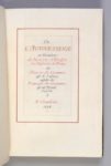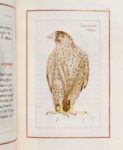 GOMMER, Pierre et François de, et Victor Bouton [calligraphe] De l’Autoursserie ou manière de nourrir et dresser les oyseaulx de poing Châlons-sur-Marne, 1594 [Paris, 20 avril 1894] SUPERBE MANUSCRIT CALLIGRAPHIÉ ET ENLUMINÉ POUR HENRI GALLICE. L’EXEMPLAIRE REJOIGNIT ENSUITE LA COLLECTION DE MARCEL JEANSON. MANUSCRIT CALLIGRAPHIÉ SUR PEAU DE VÉLIN. Calligraphie de Victor Bouton. Dédicace à Henri Gallice 134 pp. sur 67 feuillets in-4 (251 x 172mm). Entre 16 et 20 lignes par page. Encres rouge et noire, initiales et encadrement du texte enluminés, réglure rouge ILLUSTRATION : 6 figures d’oiseaux et 2 blasons peints à l’aquarelle, 4 dessins à la plume RELIURE SIGNÉE DE CHAMBOLLE-DURU. Maroquin vert, filets dorés en encadrement, dos à nerfs orné, tranches dorées sur témoins PROVENANCE : Henri Gallice (dédicace ; ex-libris) -- Marcel Jeanson (ex-libris ; Monaco, 1987, lot 269, 28.000 FF marteau) Quelques rares rousseurs Ce manuscrit copie l’édition originale imprimée en 1594, à Châlons-sur-Marne. L’Autoursserie des frères Gommer constitue, avec le traité de Charles d’Arcussia paru quatre ans plus tard, le grand livre de référence sur la fauconnerie. BIBLIOGRAPHIE : Thiébaud, 467 -- De Futaie en folio, I, pp. 316-317