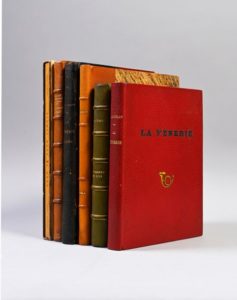 JAQUIER, Léon de La Vénerie moderne Paris, [s.n.], 1889 SIX LIVRES ILLUSTRÉS 6 volumes en tout : 1. ÉDITION ORIGINALE. In-4 (278 x 185 mm). Dessins de P. Mahler gravés sur bois. RELIURE SIGNÉE DE CREUZEVAULT. Dos long de chagrin bleu nuit, plats de papier ciré, tête dorée. Thiébaud, 519. Charnières fendues, dos abîmé. 2. LA RUE, Adolphe de, et Gaspard de CHERVILLE. Les Chiens d’arrêt français et anglais. Paris, Firmin-Didot et Cie, 1881. Édition originale. In-4. Illustrations d’Ernest Bellecroix. Reliure de l’époque. Dos à nerfs de chagrin vert, couverture conservée. Ex-libris doré de Vilmorin La Jolive poussé en queue. Dos insolé. Thiébaud, 558-559. 3. DUPLAN, Jean-Léopold. Tableau de la vénerie. Paris, NRF, 1923. Édition originale. In-8. Un des 336 exemplaires sur vélin de pur fil lafuma-navarre (n° 164). Lithographies en noirs et en couleurs de Boussingault. Reliure signée de Bernasconi. Maroquin framboise, décor mosaïqué sur le premier plat, dos long, tête dorée, couverture et dos conservés. Ex-libris de Le Moyne de Martigny (cachet humide répété). Thiébaud, 321-322. 4. MARAN, René. Mbala l’éléphant. Paris, Arc-en-ciel, 1943. Édition originale. In-4. Un des 951 exemplaires sur vélin (n° 111). Illustrations en couleurs d’André Collot. Reliure : dos long de chagrin caramel, plat supérieur de la couverture conservé. Dos insolé. Thiébaud, 1191. 5. VIALAR, Paul. Plumes dans le vent. Paris, Amiot, Dumont, 1961. Édition originale. In-4. Un des 3000 exemplaires sur vélin crèvecœur du marais. Illustrations d’Henri de Linares. Envoi autographe signé de l’illustrateur. En feuilles, couverture illustrée, étui cartonné de l’éditeur. 6. OSMOND, Rainulphe Marie Eustache, comte d’. Les Hommes des bois. Paris, Hazan, 1957. Deuxième édition. In-8. Un des 36 exemplaires sur chiffon de rives (n° 27), deuxième papier, avec un dessin original et une suite. Illustrations de Karl Reille. Un dessin original en couleurs signé de Karl Reille requis, (154 x 233 mm), encre et crayons ; suite requise en noir de toutes les illustrations. Reliure : dos à nerfs et coins de maroquin vert, tête dorée, couverture et dos conservés. Ex-libris du comte Georges Thibault de La Carte de La Ferté-Sénectère (1913-1992 ; ex-libris ; sa vente, Blois, 2021, n° 708). Légères brunissures sur les témoins
