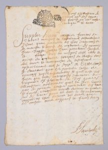 LANTADE, S. [Pièce signée]. [Plainte pour infraction au droit de chasse]. S. l. n. d. [vers 1700] INFRACTION AU DROIT DE CHASSE SUR LES TERRES DE FRANÇOIS DE VABRES, MARQUIS DE CASTELNAU. LES NOMS DES BRACONNIERS SONT Dénoncés Manuscrit, 1 p. in-8, encre brune (172 x 245mm). “Supplie humblement Messire de Vabres, marquis de Castelnau [...] au préjudice des édits de Sa Majesté et arrêt de règlement, les nommés Jean Taysse [...] ont [...] entrepris de chasser dans les terres et marquisat de Castelnau”... Pâle mouillure au centre de la feuille