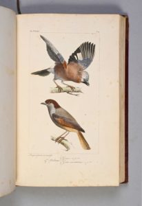 LEMAIRE, Charles Histoire naturelle des oiseaux d’Europe Paris, L. de Bure, Pauquet, [1837] BON OUVRAGE ILLUSTRÉ ÉDITION ORIGINALE. In-8 (233 x 149 mm). (2) ff., 203 pp. 1 titre gravé mis en couleurs et 80 planches gravées sur acier par Pauquet d’après ses propres peintures, toutes coloriées à l’époque. RELIURE DE L’ÉPOQUE. Dos long et coins de maroquin prune, dos long joliment orné de fers aux oiseaux, plats de percaline prune, tête dorée. Nissen, 541. Légères piqûres éparses, petite mouillure claire marginale à certaines planches. Tranchefile supérieure manquante, dos fané