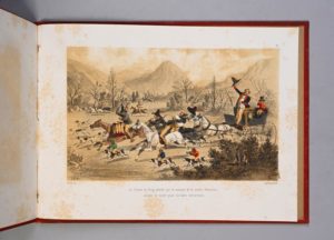 [MARC, Eugène, et A. DURUY] Croquis de chasse. Le Drag de Pau [Paris], Becquet frères, [vers 1860] BEL ALBUM SATIRIQUE ÉDITION ORIGINALE. In-4 oblong (250 x 335 mm). Texte du marquis de Foudras, “Histoire anecdotique de la vénerie contemporaine. État actuel de la vénerie d’importation dans le Béarn. Le Drag de Pau”, extrait du Sport du 6 octobre 1858. (2)-(14) ff. 14 lithographies en couleurs de Marc et Duruy, certaines gommées. Les planches sont légendées d’extraits du texte du marquis de Foudras. RELIURE DE L’ÉDITEUR. Percaline rouge, plats ornés à froid, titre doré sur le premier plat. PROVENANCE : Paul Pouperon (ex-libris). Thiébaud, 631 -- Schwerdt, I, 129 (qui tous deux ne signalent que 13 planches). Rousseurs. Dos fané
