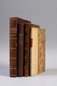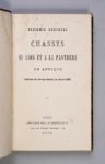 MONTHOIS, Robert La Noble et Furieuse Chasse du loup Paris, Léon Téchener fils, 1865 QUELQUES OUVRAGES 1. In-12. Titre en rouge et noir, initiales, bandeaux et culs-de-lampe gravés. Frontispice gravé à l’eau-forte. Tiré à petit nombre sur Hollande. Demi vélin, dos à la bradel. Thiébaud, 667. 2. GASTINEAU, Benjamin, Chasses au lion et à la panthère en Afrique. Paris, Hachette, 1863. In-8. ÉDITION ORIGINALE. 17 dessins de Gustave Doré. RELIURE DE L’ÉPOQUE. Dos de chagrin brun, plats de papier marbré. Thiébaud, 446. Quelques piqûres et marques d’usure à la reliure. 3. GARNIER, Pierre, Chasse des mammifères, Paris, Jules Martin, 1883. ÉDITION ORIGINALE. In-8. Dos de percaline brune, plats de papier marbré. Thiébaud, 445. Nombreuses annotations. 4. DIGUET, Charles, Le Livre du chasseur. Paris, Fayard, [1881]. ÉDITION ORIGINALE. In-8. Nombreuses gravures dans le texte. RELIURE DE L’ÉPOQUE. Dos de chagrin brun, plats de papier marbré. Reliure frottée, papier roussi. Thiébaud 278