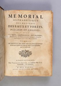 [NOËL, Michel] Mémorial alphabétique des matières des eaux et forêts, pesches et chasses Paris, Théodore Legras, 1737 Deuxième édition. In-4 (253 x 191 mm). (12) ff., 756-84 pp., (1) f. RELIURE DE L’ÉPOQUE. Veau brun moucheté, dos à nerfs orné, tranches rouges. Thiébaud, 685-686. Petite mouillure aux premiers feuillets, taches sur la page de titre. Coiffe supérieure abîmée, coiffe inférieure et coins restaurés.
