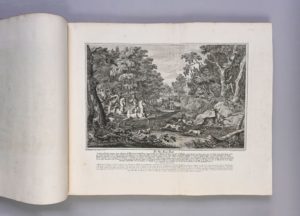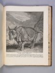 RIDINGER, Johann Elias Fürstenlust oder der Edlen Jagdtbarkeit... Parfaite et exacte Représentation des Divertissemens de Grands Seigneurs ou Parfaite Description des Chasses de toutes sortes de Bêtes... les propres termes de la vénerie, dont on sert parmi les Chasseurs d’un chaque pays Augsbourg, Johann Elias Ridinger, 1729 RÉUNION DE SUPERBES PLANCHES DE JOHANN ELIAS RIDINGER : “TÊTES BIZARRES” ET TROPHÉES, SCÈNES DE CHASSE INCROYABLES ÉDITIONS ORIGINALES In-folio (435 x 335mm) (1). Fürstenlust... COLLATION et ILLUSTRATION : titre bilingue dépliant, 12 premières planches (sur 36) dont 4 grandes planches dépliantes ; (2). Abbildung der Jagdbaren Thiere..., Augsbourg, Johann Elias Ridinger, 1740. COLLATION et ILLUSTRATION : titre imprimé en rouge et noir avec grande vignette gravée et préface imprimée au verso, 23 planches d’animaux avec volcelets en bas de chaque planche. (3). [Genaue und richtige Vorstellung der wundersamten Hirschen...]. COLLATION et ILLUSTRATION : sans le titre, 70 planches (sur 100) montrant de très spectaculaires “têtes bizarres” tirées par des Princes allemands. (4). [Jäger und Falkoniers]. COLLATION et ILLUSTRATION : aucun titre requis par Schwerdt, 15 planches (sur 25), sans numéro, correspondant aux lettres de Schwerdt : I, C, K, A, E, G, B, D, H, F, L, M, N, O, P, soit en tout 120 planches dont 105 sont des gravures originales de Johann Elias Ridinger, c’est-à-dire dessinées et gravées par lui, et 15 des planches gravées par son fils Martin Elias Ridinger d’après les dessins de Johann Elias Ridinger son père RELIURE FRANÇAISE DE L’ÉPOQUE. Veau marbré, encadrement de filets dorés, dos à nerfs orné, tranches dorées Dos refait Les planches de Ridinger étaient reliées au fur et à mesure de leur publication. La complétude des exemplaires est donc souvent très relative, surtout quand il s’agit des rares exemplaires en reliure de l’époque. La qualité des gravures de ce grand artiste allemand est à admirer planche par planche, isolément. À propos du recueil Vorstellung der wundersamten Hirschen, J.-C. Brunet indique par exemple : “les éditions antérieures sont moins complètes mais elles renferment de meilleures épreuves ; nous en avons une qui contenait seulement 70 planches publiées de 1740 à 1756, sans titre” (Brunet, IV, 1298). C’est précisément le cas ici. BIBLIOGRAPHIE : Thiébaud, 783-784 -- Schwerdt III, (1) : p. 134, (2) : p. 137, (3) : pp. 138-139, (4) : pp. 136-137 -- Brunet, Manuel, IV, col. 1297-1298