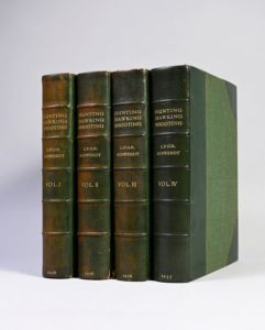 SCHWERDT, C.F.G.R. Hunting, Hawking, Shooting, illustrated in a Catalogue of Books, Manuscripts, Prints and Drawings Londres, Privately printed for the author, Waterlow and Sons Limited, 1928-1937 BON EXEMPLAIRE D’UN CATALOGUE FONDAMENTAL ET IRREMPLAÇABLE ÉDITION ORIGINALE. 4 volumes in-folio (3232 x 255mm). TIRAGE à 300 exemplaires numérotés, celui-ci numéroté 52, signé par Schwerdt. ILLUSTRATIONS : nombreuses planches parfois en couleurs. RELIURES SIGNÉES DE KELLY. Dos et coins de chagrin vert, plats de percaline verte, non rognés, têtes dorées Quelques charnières usées