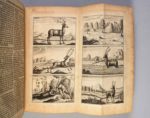 TÄNTZER, Johann Der Dianen Hohe und Niedere Jagd-Geheimnisse... mit Hirsch-gerechtem Jäger... von Johann Wilhelm von Pärson Leipzig, Weidmann, 1734 ÉDITION COMPLÈTE DU GRAND LIVRE DE CHASSE ALLEMAND Première édition collective (et quatrième édition) des Dianen de Täntzer. Édition originale de la Chasse au cerf (“Hirsch-gerechtem Jäger”) de Pärson. 2 parties en un volume in-folio (323 x 208mm). Initiales et culs-de-lampe gravés. π6 )(4 A-Z4 Aa-Bb4 ; A-O4 P6. CONTENU : π1 : faux-titre, π2 : frontispice, π3 : titre, π4 : dédicace, π6v : préface, )(1 : texte, Bb4v : sommaire ; A1 : titre, A2 : préface, A3v: texte, P6 : table des matières. ILLUSTRATION : un frontispice, 59 planches gravées sur cuivre (toutes dans la première partie). RELIURE DU XVIIIe siècle. Dos de vélin avec titraison à l’encre, plats de papier. PROVENANCE : Fortunato de Castelli (ex-libris). Schwerdt, II, 246 -- Souhart, 453 -- Lindner, 11.2041.01 et 11.1575.01. Rousseurs, restauration marginale en I1. Reliure restaurée Le premier ouvrage rassemble les trois parties des Secrets de chasse de Diane de Johann Täntzer parues d’abord séparément à Copenhague. Le second ouvrage, La Chasse au cerf de Pärson, est édité pour la première fois ici.