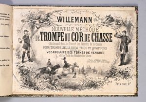 TELLIER Nouvelles fanfares pour une ou deux trompes Paris, A. Meissonnier, [vers 1845-1860] SIX RECUEILS DE FANFARES 6 ouvrages reliés en un volume in-8 oblong (170 x 260mm) : 1. Thiébaud, 383. 2. Du même, Cinq fanfares nouvelles et une messe de St Hubert. Composées pour deux trompes… Paris, A. Meissonnier & Heugel, [vers 1860]. Sans le feuillet de titre. Thiébaud, 382. 3. Du même, Les Plaisirs de la chasse. Recueil de nouvelles fanfares pour une ou deux trompes... Paris, S. Waresse, [vers 1845]. Thiébaud, 383. 4. Du même, Grand album du chasseur... Paris, A. Meissonnier & Heugel, [1848]. Thiébaud, 383. 5. [JOUVE], Collection de soixante deux fanfares ou airs de chasse avec paroles anciennes et nouvelles à une ou deux trompes. Paris, Hentz-Jouve, [vers 1850]. Intercallé dans le recueil précédant. Thiébaud, 375. 6. P. MELCHIOR, Ordonnance de chasse arrangée pour quatre trompes… Paris, A. Meissonnier, |vers 1850]. Thiébaud, 378 RELIURE de la fin du XIXe siècle : demi-chagrin vert, dos à nerfs. PROVENANCE : Auguste Veinant ? (ex-libris). Marge supérieure courte [Avec un autre volume :] Willemann, Nouvelle méthode de trompe ou cor de chasse. Paris, Le Bailly, [1879]. In-8 oblong. 32 pp., [2] pp. Broché, monté dans une chemise cartonnée illustrée, couverture conservée. Page de titre remontée entre les pages 4 et 5, taches d’encre à la couverture, ruban adhésif