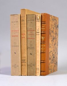 WITT, Jean de [Ensemble de cinq ouvrages de Jean de Witt] 1935-1949 LOT DE CINQ LIVRES DE JEAN DE WITT, TOUS ILLUSTRÉS PAR JOSEPH OBERTHUR 1. Chasses de Brière. Paris, La Bonne idée, 1935. Édition originale. In-8. Exemplaire ordinaire non numéroté. Illustrations de Joseph Oberthur. Broché. Jeu dans le premier cahier. Joints : 2 exemplaires du prospectus d’édition, 4 pp. in-8. 2. En chassant des Landes aux Pyrénées. Paris, La Bonne idée, 1937. Deuxième édition. In-8. Un des 800 exemplaires non numérotés sur hivélio. Illustrations de Joseph Oberthur. Envoi autographe signé : à Monsieur Charles Salmon, très cordial hommage, de Witt. Broché. 3. Émotions de chasse. [Paris], Librairie des Champs-Élysées, 1941. Édition originale. In-8. Un des 1200 exemplaires sur alfélio. Illustrations de Joseph Oberthur. Reliure : dos à nerfs de chagrin fauve orné et doré, premier plat de couverture conservé. 4. En chassant ici et là. Paris, Durel, 1948. Édition originale. In-8. Un des 1200 exemplaires sur alfa (n° 644). Illustrations de Joseph Oberthur. Broché, couverture illustrée à rabats. Couverture usée et piquée, dos fatigué. Joint : 1 diplôme de la foire-concours de chiens de la société “le Saint-Hubert Lafrançaisain” en date du 29 septembre 1932, 1 p. in-4. 5. Chasses de Brière. Paris, Nouvelles Éditions de la Toison d’Or, 1949. In-8. Exemplaire ordinaire non numéroté. Illustrations de Joseph Oberthur. Broché. BIBLIOGRAPHIE : Thiébaud, 1273-1274