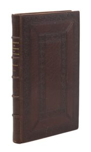 Paris, Claude Chevallon, 1525. 2 parties en un volume in-8, maroquin brun, double encadrement de frises de rinceaux serties de filets à froid, dos orné de caissons à froid, filets intérieurs dorés, doublure et gardes de vélin blanc, tranches dorées (Gruel).Édition gothique excessivement rare, dont deux exemplaires seulement sont conservés dans les collections publiques mondiales – à Beaune et à Ciudad Real, en Espagne.